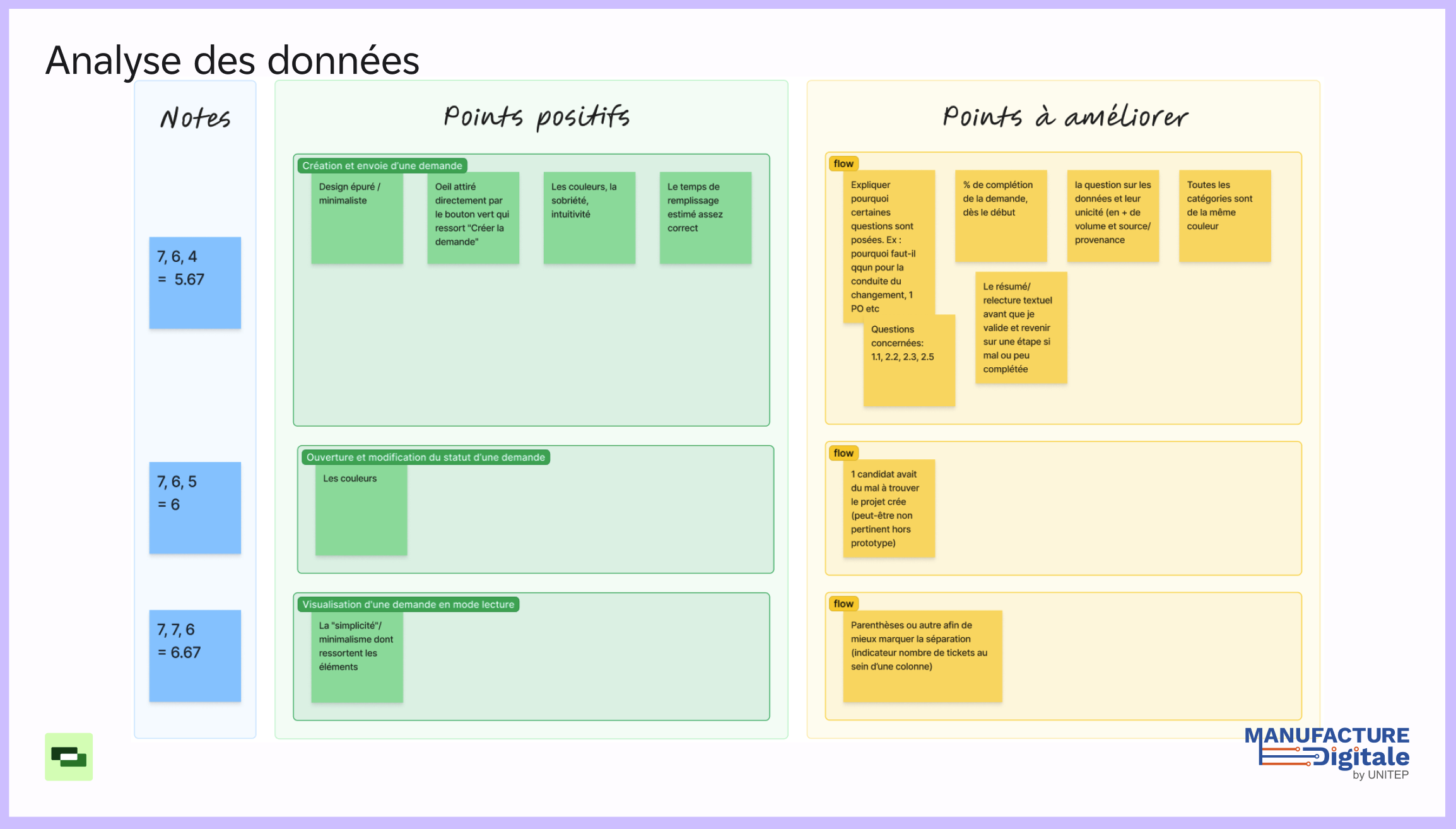 Based on user feedback, several opportunities for improvement were identified alongside what worked well. Users found flows intuitive, the design clean, and the use of color effective, with an average satisfaction rating of 6/7.